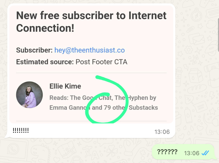 sent me a screenshot of part of my Substack profile, with the number of publications I’m subscribed to circled and the caption “!!!!!!!!”I replied — within the same minute, clearly I was exceptionally hard at work — with “??????” (would you believe we’re both writers and have two English and Linguistics degree between us?)